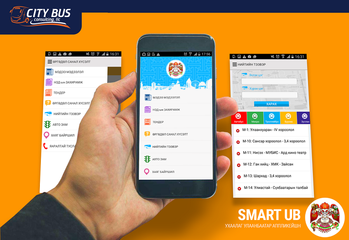 Нийслэлийн Мэдээлэл технологийн газраас “Ухаалаг Улаанбаатар” аппликэйшн бүтээж, нийслэлийн үйл ажиллагаатай холбоотой бүхий л мэдээ мэдээллийг хүргэдэг болсон. Үүний нэг нь нийслэлийн нийтийн тээврийн бүх чиглэлийн мэдээллийг оруулж, хаанаас ямар автобусанд сууж зорьсон газраа хүрэхийг санал болгохоос гадна авто замын ачаалал, засвартай, засахаар төлөвлөсөн замуудын мэдээллийг харах боломжтой.