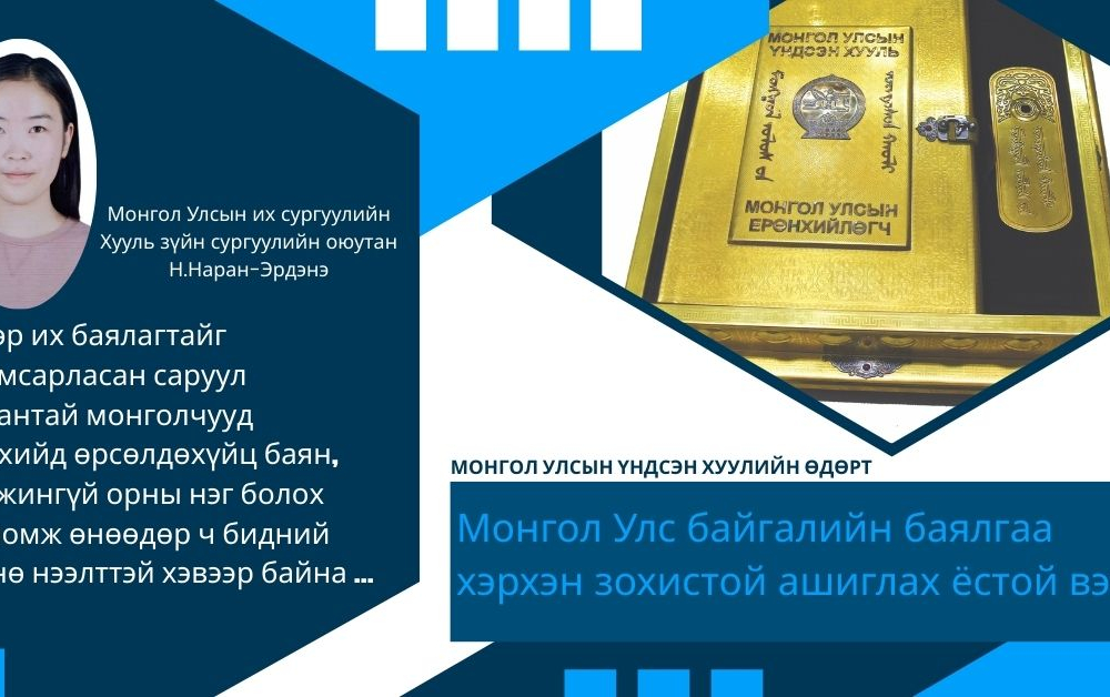 Монгол Улсын Үндсэн хуулийн өдөрт зориулан Улсын Их Хурлын Тамгын газар, Парламентын судалгаа, хөгжлийн хүрээлэнгээс зохион байгуулсан “Монгол Улс байгалийн баялгаа хэрхэн зохистой ашиглах ёстой вэ” сэдэвт уралдааны их, дээд сургуулийн оюутны ангилалд хоёрдугаар байр эзэлсэн Монгол Улсын их сургуулийн Хууль зүйн сургуулийн оюутан Н.Наран-Эрдэнийн эсээг толилуулж байна.